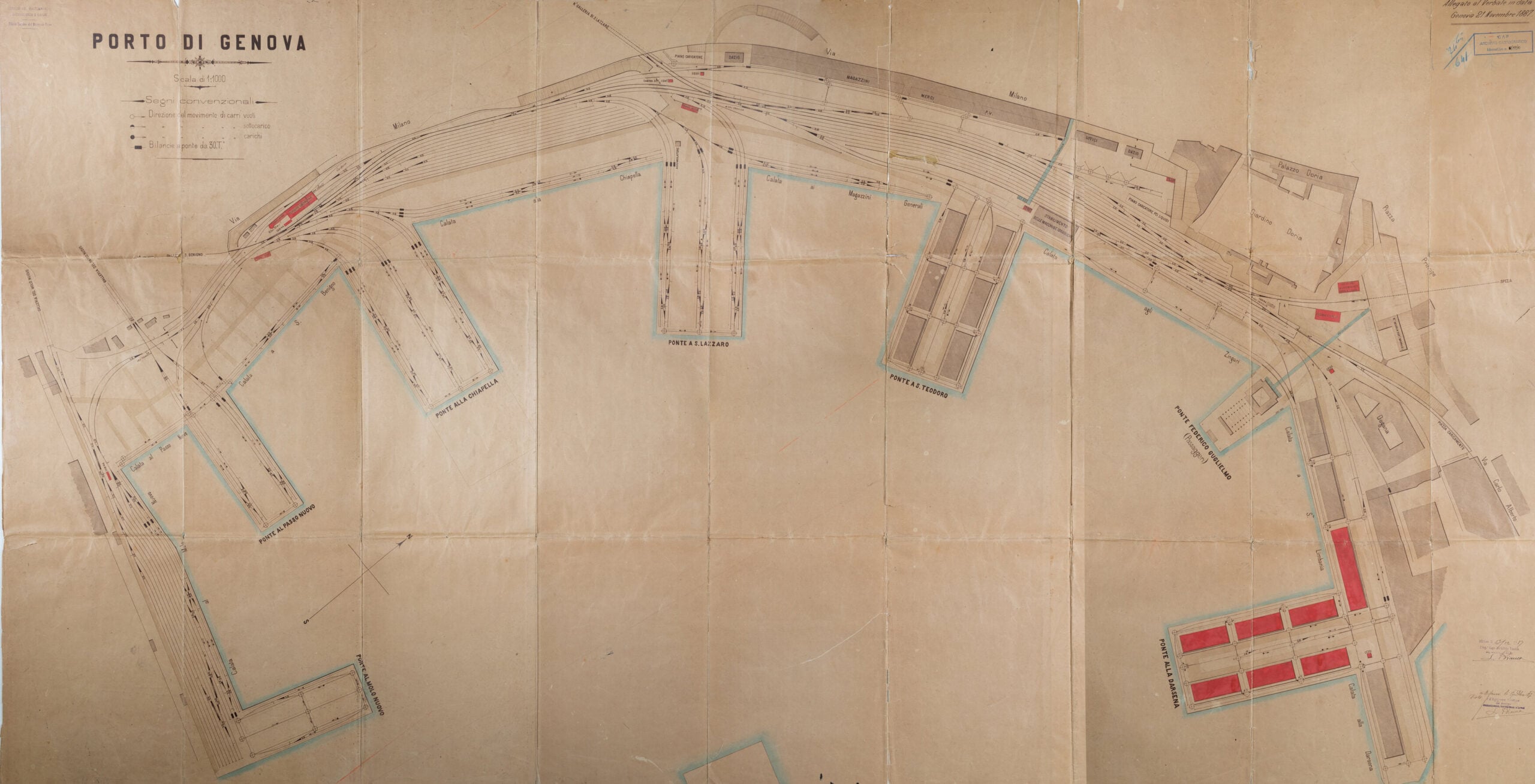 Il materiale copre un arco che va dalla metà del XIX secolo al 1903, quando la gestione verrà affidata al nuovo Consorzio Autonomo del Porto. Tra le pagine spiccano le figure dei protagonisti, su tutti l’ingegnere Adolfo Parodi, instancabile direttore tecnico delle opere finanziate dal Duca di Galliera. È lui a tradurre in progetti concreti la grande stagione di lavori che ridisegna Genova: moli, ponti, calate, bacini di carenaggio, collegamenti ferroviari. Documenti e corrispondenze permettono di seguire passo dopo passo la realizzazione della Convenzione Galliera, un’impresa titanica che trasformò il porto in un cantiere aperto per oltre un decennio.